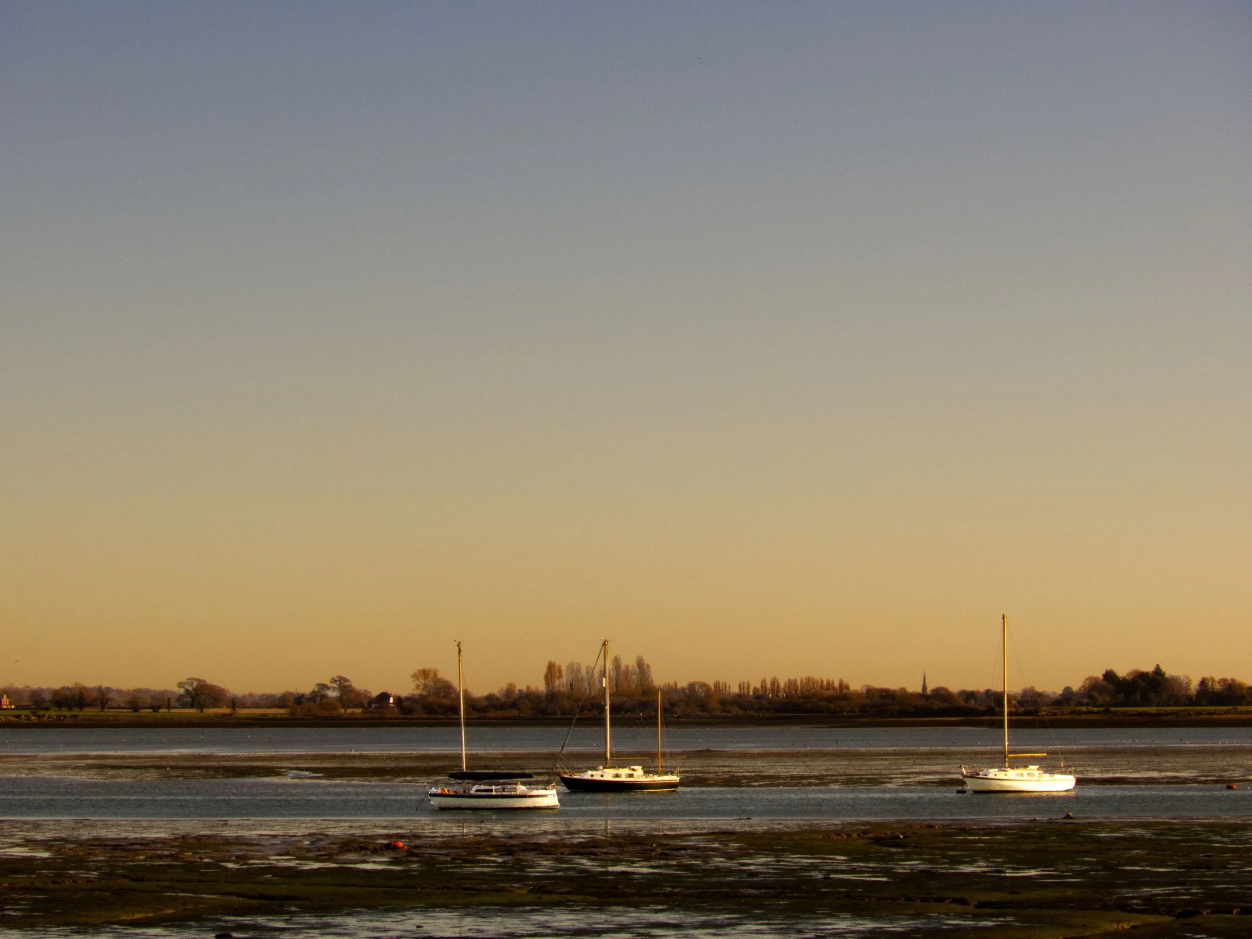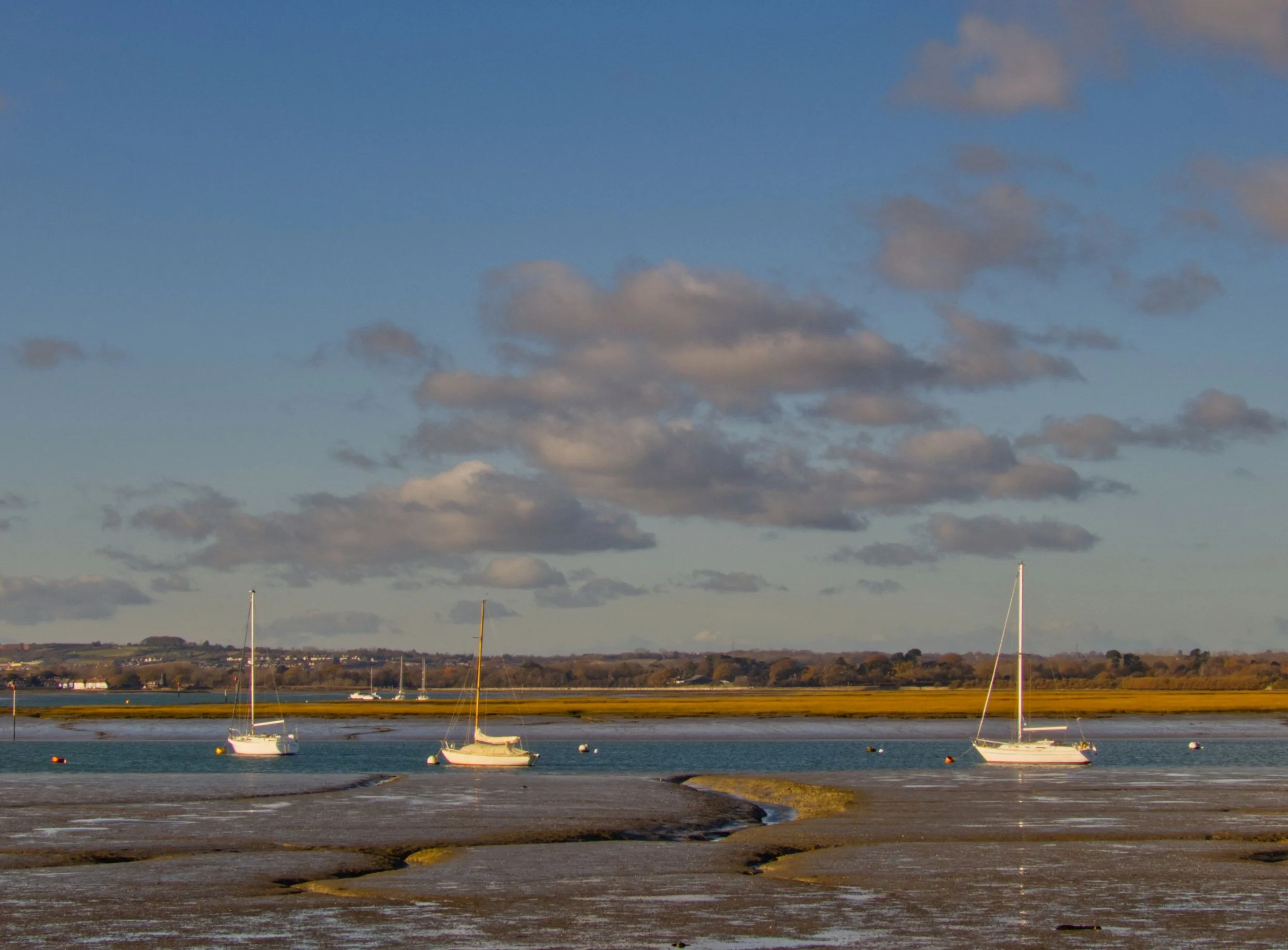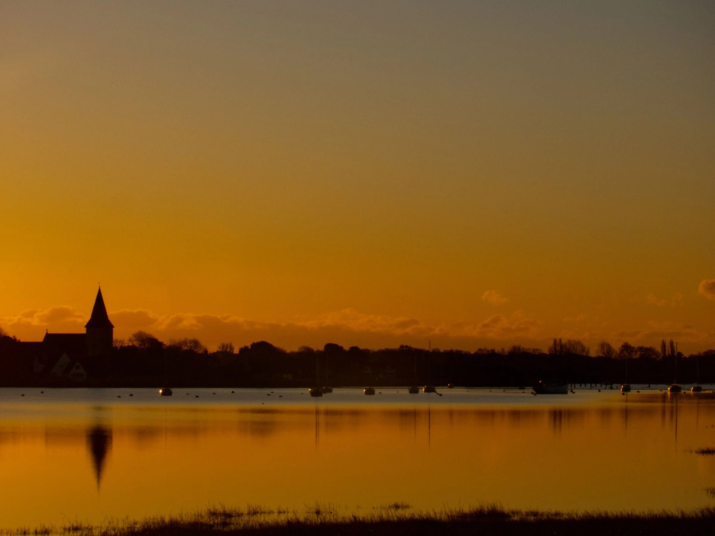 30th November 2025. Continuing around the channels and creeks of Chichester Harbour. Watching the sun rise above Bosham, while tracing the coast past Chidham, round Cobnor Point, and up past the Nutborne Marshes. A stillness on the air, and on the water. Reaching Thorney Island, the way barred by a gate as, on crossing the Great Deep, the land becomes military, headquarters of the Royal Artillery. But so long as you promise to keep to the coastal path, they let you through - after their cameras have had a good look at you. Salt marshy down one side, giving way to the sands of Pilsey. Then back up Emsworth Channel, to reach the Hermitage Bridge, and the crossing into Hampshire. The end of the Sussex has been reached. 15 miles (Total walked 893 miles, 155 in Sussex)